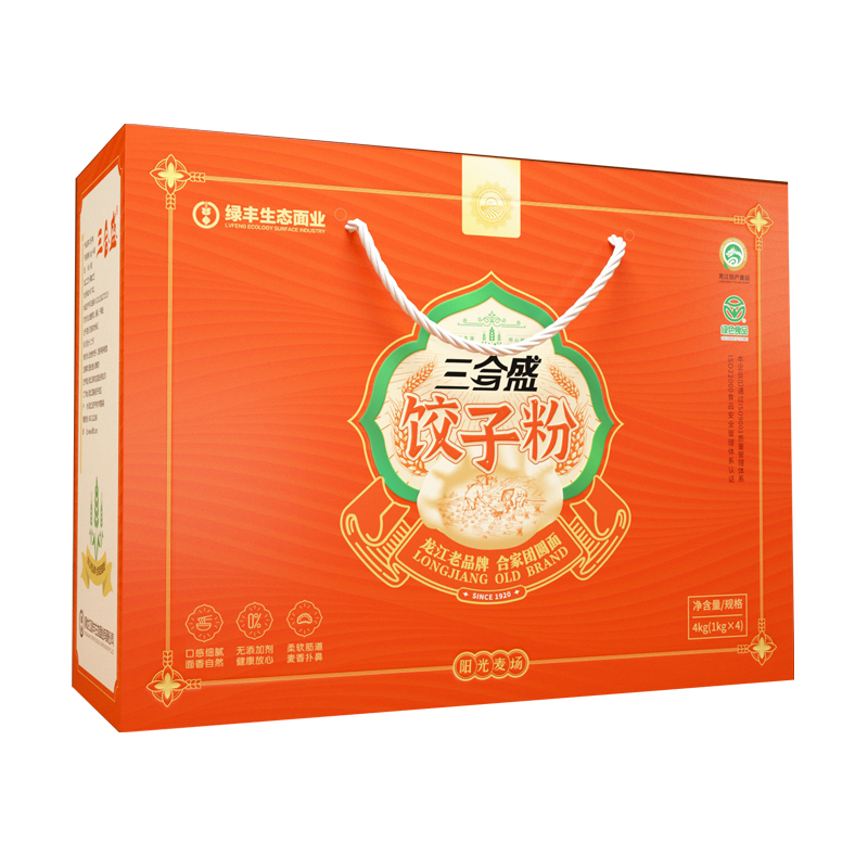 产品中心 product center 沙子面沙子面 饺子粉饺子粉 雪花粉雪花粉 特精粉特精粉 麸星粉麸星粉 全麦粉全麦粉 富硒面粉富硒面粉 其 他其 他 产品名称 :4kg饺子粉 配料:小麦质量等级:标准生产日期:见包装封口处保质期:十二个月生产许可证编号: SC10123022731519执行标准: GB/1355产地:黑龙江.富裕贮存方法:放置阴凉、通风干燥处生产制造:黑龙江绿丰生态面业有限公司工厂地址:黑龙江富裕经济开发区全国服务热线: 0452- 8900008邮箱: lfstmy@163.com网址: www.绿丰.com