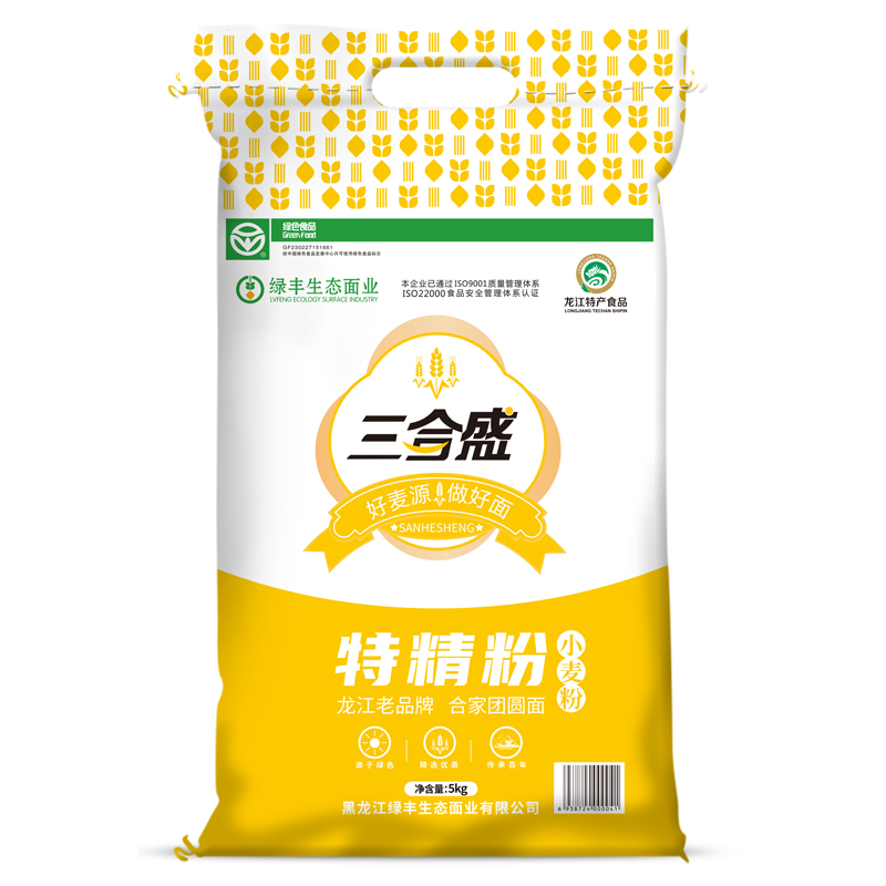 产品中心 product center 沙子面沙子面 饺子粉饺子粉 雪花粉雪花粉 特精粉特精粉 麸星粉麸星粉 全麦粉全麦粉 富硒面粉富硒面粉 其 他其 他 产品名称 :5kg特精粉 配料:小麦质量等级:标准生产日期:见包装封口处保质期:十二个月生产许可证编号: SC10123022731519执行标准: GB/1355产地:黑龙江.富裕贮存方法:放置阴凉、通风干燥处生产制造:黑龙江绿丰生态面业有限公司工厂地址:黑龙江富裕经济开发区全国服务热线: 0452- 8900008邮箱: lfstmy@163.com网址: www.绿丰.com